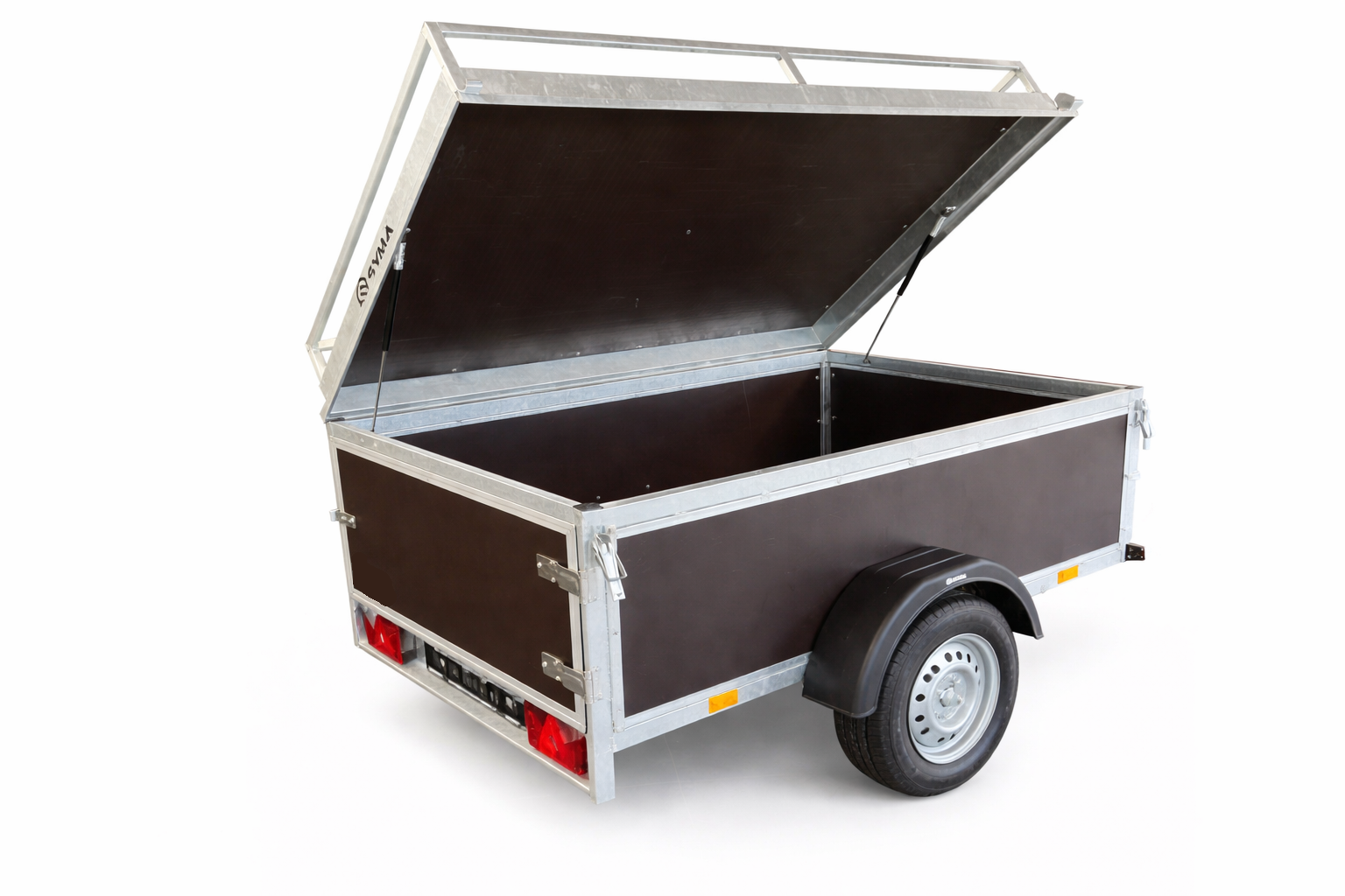 Elke gesloten Syma-aanhanger heeft aandacht gekregen voor details: het laadplatform is vlak en solide en de overgang tussen chassis en laadruimte is zorgvuldig ontworpen. De verlichting is netjes geïntegreerd in de carrosserie en voldoet aan de wettelijke normen. Dankzij de degelijke koppeling verloopt aankoppelen moeiteloos.