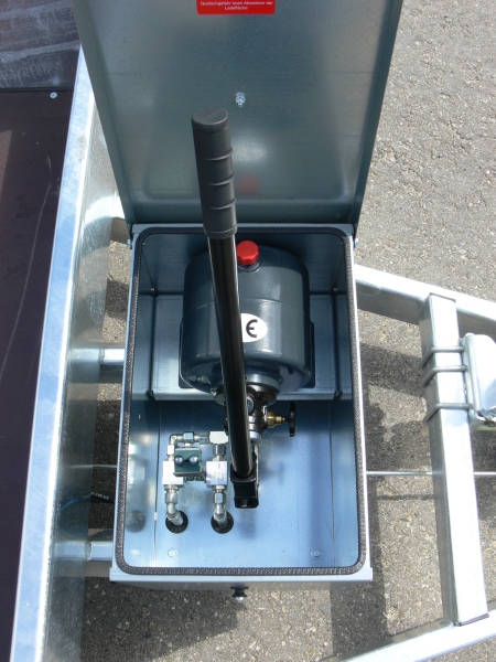 - Handpomp met hydraulische bediening voor het afzakken en oppompen van de aanhanger, met verlaginsklep.