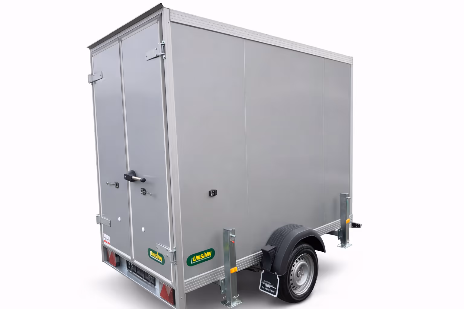 - Dubbele achterdeuren met aluminium scharnieren.