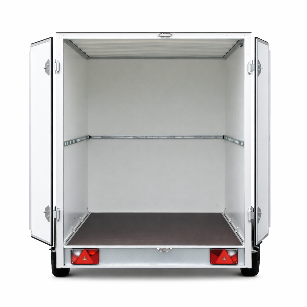De aanhanger heeft een verzinkt en stevig gelast staalchassis, dit zorgt voor goede stabiliteit. De wanden zijn van sandwichpanelen dit is een hoogwaardige gladde buiten laag, met gel-coat-afdichting, in de kleur wit. De gel-coating zorgt ervoor dat de aanhanger niet verkleurd.